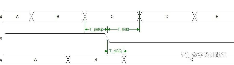 在使能端由高电平向低电平变化过程中,为了使锁存器正确锁存住数据,需要对输入数据的时间加以约束,因此便有了锁存器的建立时间和保持时间,即图2中的T_setup 和T_hold 。锁存器的这两个时序特性定义跟触发器很相似,不同的是在锁存器上这两个时序约束条件发生在使能端由高电平向低电平转化时。图2中的T_dGQ为使能端到输出端的延时。