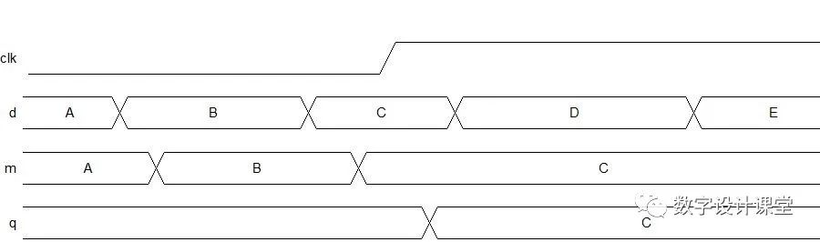 为了进一步了解主从锁存器的工作原理,示例的波形图如图4所示。可以看到,当clk为低时,m跟随d变化;当clk由低变高,主锁存器锁存输入值,中间m停止变化,此时从锁存器打开,经过一段延迟后将中间信号送至输出。