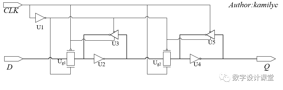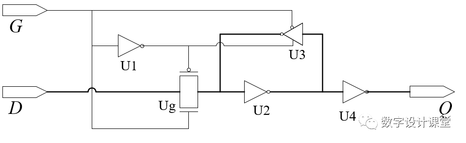 当G为高电平时,传输门Ug打开,信号从D端输入,经过Ug、U2、U4到达输出端Q,此时三态反相器为关闭状态;当G端变为低电平时,传输门关闭,U3打开,此时U2、U3构成双稳态器件将输入信号保持,输出端Q也稳定输出双稳态器件保持的信号。