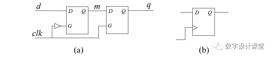 图3 (a)两个锁存器组成的触发器 (b)触发器符号表示