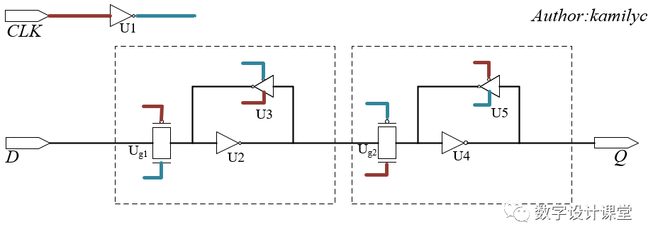 在图8中,主锁存器和从锁存器分别用虚线框出,红色连线为clk信号,蓝色连线为经过反相器U1后的clk信号。