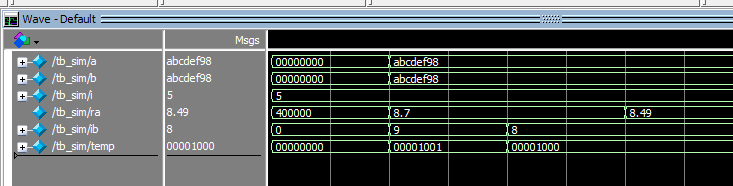 `timescale 1ns/1ps module tb_sim(); reg [31:0] a = 0; reg [31:0] b = 0; integer i; always@(*) for (i = 1; i <= 4; i = i + 1) b[(i*8-1)-:8] = a[(i*8-1)-:8]; initial begin a=0; b=0; #10 a=32'habcd_ef98; #10; end //========================================================== real ra; integer ib; reg [7:0] temp; initial begin ib=0; ra = 4e5; #10 ra=8.7; //ra可以真实得到8.7 ib = ra; //ib=9 #10 ib=8.49; //ib=8 #10 ra=8.49; //ra = 8.49 #10 ib=ra; //ib=8 #200; $stop(); end always@(*) temp = ib; //temp 值变化0----9---8 endmodule