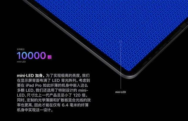 什么是MINI LED,简单来说就是把LCD屏背后的LED灯珠层上的灯珠做的尽可能地小,通常都在50微米-200微米左右,比传统的LCD屏要小的小的多,这样就可以实现近乎于OLED屏的像素级的区域控光(只是近乎于),目前市面上最知名的采用MINI LED技术的产品就是苹果的新版iPad Pro 2021 12.9英寸版,其通过内置10000颗LED灯珠,实现了2500个区域的独立控光。