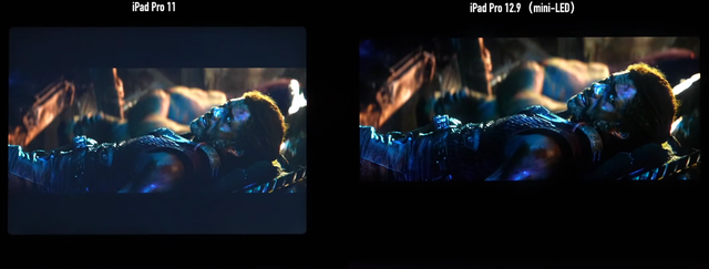 简单来说,现阶段的MINI LED也具备了显示黑色背景时直接关闭发光源的功能,这样就能够实现更高的对比度,我直接援引一下钟文泽的视频对比,大家可以看一下,效果还是非常明显的。