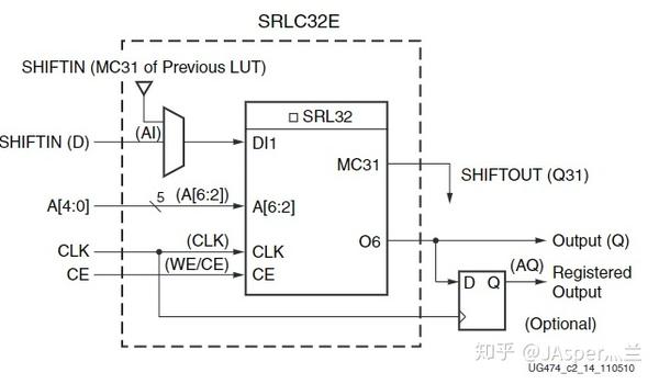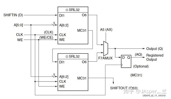 - 32位移位寄存器,SRL32E(图9)。它支持最高32位的移位输出,可以选择普通数据(D)输入,也可以选择由上一级SRLC32E的SHIFTOUT作为输入。如果想用SRLC32E做12位移位输出,只需要将A[4:0]设置为5'd12,移位输出结果在SHIFTOUT口输出,与此同时O6也将会输出地址5'd12的结果,相当于一个32x1单端口DRAM(这地址是对于SRLC32E外部接口A[4:0]来说的,对于SRL32内部来说它是将高5位地址A[6:2]设为5'd12)。特别注意:SRLC32E只能在同一时钟域使用,不能做跨时钟域打拍使用,因为它内部移位操作不是用32个级联的触发器来做的,而是将上一级的电荷转移到下一级,如果第一级发生出现亚稳态,它将会一直传递到最后一级。