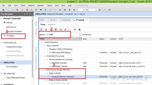 - 在VIVADO工程下点击打开IP Catalog->搜索RAM->找到Distributed Memory Generator 并点击打开。(图15)