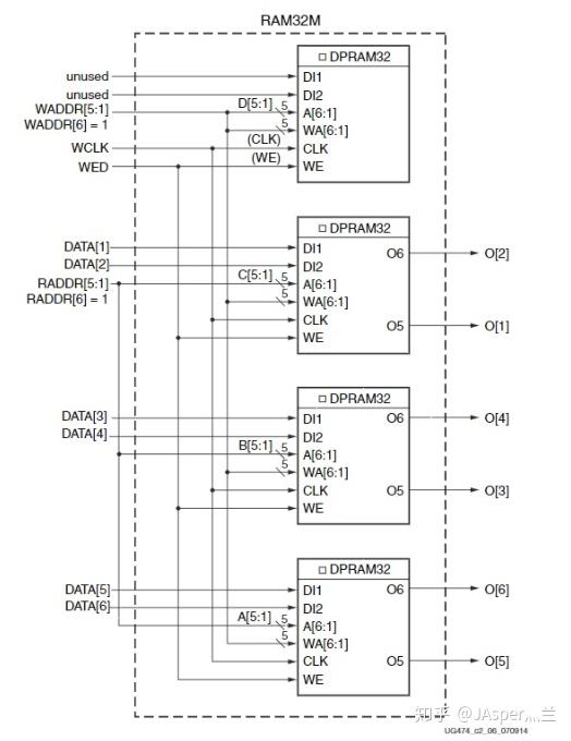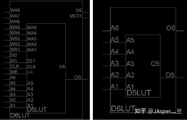 因此SLICEM的LUT6可以读写存储数据,而SLICEL的LUT6只能读数据不能写。这就是为什么SLICEM的LUT6可以做RAM,而SLICEL的LUT6只能做ROM。
