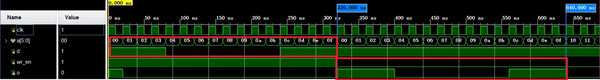 - 接下来我将对例(1),例(2)进行仿真,由于我们的例(1),例(2)的顶层的输入输出是一样的,所以两者的testbench一模一样,我们往地址0~15依次写入1111_0000_0000_1111。图11为例(1)仿真结果,两个红色框中输入d的内容和输出o的内容是一样的。至于蓝色框出现不定态x,是因为我没有将例(1)中的RAM初始化。图12为例(2)的仿真结果,结果与例(1)类似,这里写入时,o的输出为我们预先写入的初始值0。