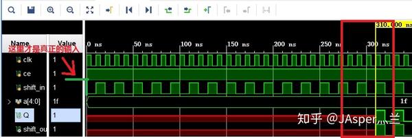 - 接下俩我们对例(3),例(4)进行仿真。我们在测试用例中每个时钟(周期10ns)上升沿依次写入10101010。。。(记住,第一个数是1)。忽略寄存器未初始化所带来的不定态,正常来说我们会在第32拍得到移位后的结果10101010。。。我们可以看到例(3)仿真结果(图13)在310ns时输出第一个1,但是例(4)仿真结果(图14)在330ns时才输出第1个1,那么哪一个才是对的呢?对此我个人理解例(3)的仿真结果是正确的,在0ns的时候我们可以看到shift_in是0,而不是我们的初始值1,因此寄存器已经在0ns时打了1拍,在310ns输出1,刚好打了32拍。例(4)与预期不符的原因应该是仿真工具在0ns中没有打拍,而是在10ns时打第一拍(初学者应注意:10ns时的输入应该10ns前已经稳定好的那个数值,不是10ns下面所对应的数值),此时输入时0,所以在打第32拍(320ns)时输出是0。