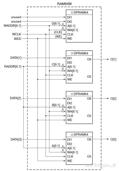 - 单端口DRAM:同步读,同步写(均以A[5:0]为输入地址),结构如图3所示。D为数据输入,O为数据输出,WCLK为同步时钟,WE为写使能(当要写数据到DRAM时置高,当要从DRAM中读数据时置低)