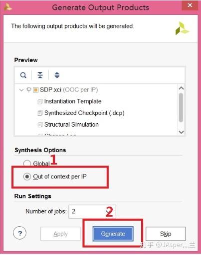 - 期间有OK点OK,然后选择Out of context per IP(Global和Out of context per IP的区别就是一个随整个工程一起编译,另一个是作为一个模块单独编译),点击Generate等待IP编译完成。(图17)