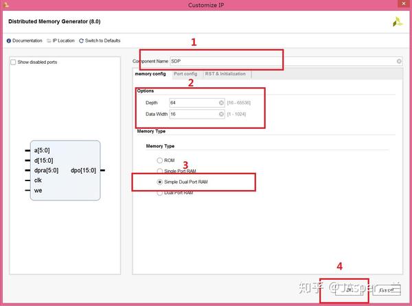 - 在memory config ,先给这个IP起个帅气,让你印象深刻的,有代表意义的名字,如 SDP。然后再设置深度为64,宽度16。再将Memory Type设置为Simple dual port。如果有需要添加输入输出寄存器的话在Port config中设置,如果要初始化DRAM的值我们在RST&Initialization中设置,这里我们暂时没这需要,直接点OK就行(图16)