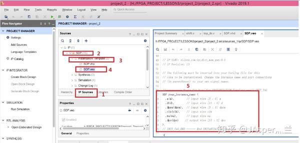 - 最后在IP SOURCE 中点击SDP->Instantiation Template-> SDP.veo(veo 为verilog,vho为vhdl)打开SDP这个IP的模板,并复制到自己的工程,根据需求自己做相应的修改。(图18)