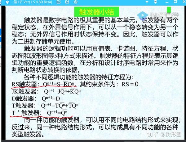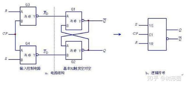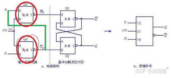而在CP=1时,R-S触发器的前面的两个与非门(见图中红圈圈出的)就等于非门。如果我们让R等于S的非那么一定不会出现(1,1)的情况。