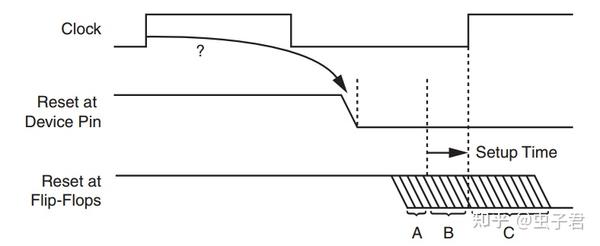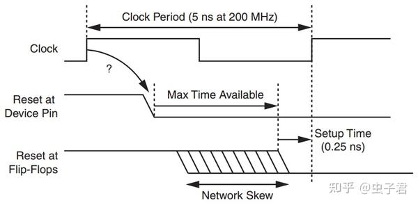 首先看图1,考虑复位信号在两个时钟沿之间被释放的情况。Reset 信号从 Device Pin 到 Flip-Flop 的延迟最大不能超过“Max Time Available”,如果延迟超过了这个限制,那么复位信号的释放会进入 Setup Time 要求的区间,导致 Flip-Flop 进入亚稳态。当时钟频率变高,时钟周期变短,不难发现,要满足这个要求是越来越难的。