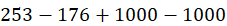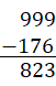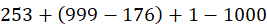 由于操作数是三位数,所以我们这里使用了999。从一串9中减去一个数叫做对9求补数,176对9的补数是823.计算出补数后,将补数与原来的被减数相加就可以得到1076,最后再将结果加上1,并减去1000。这样我们就得到了结果77,而且没有使用到借位。原理是这样的: