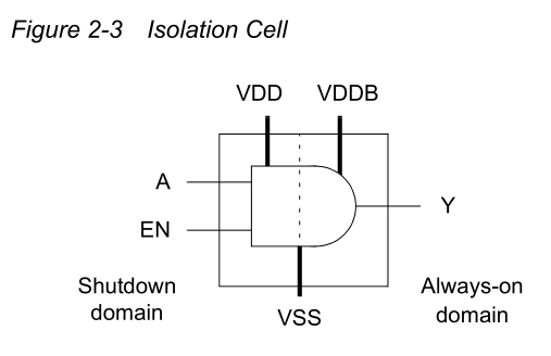 通常用于电源关断技术(PSO)和多电源多电压技术(MSMV)。起到不同电压域之间的电压钳制和隔离作用。iso cell 有一个控制端 EN, 当 EN 无效时, A 端信号直接送到 Y 端,此时 iso cell 等效于一个buffer;当 EN 有效时,buffer 断开,Y 端保持固定的高电平或者低电平;上面这种 iso cell 有两组 power: primary power VDD 和 backup power VDDB,当 左边domain 关掉时, VDD off,此时就由 VDDB 供电,维持 Y 端的固定电平。