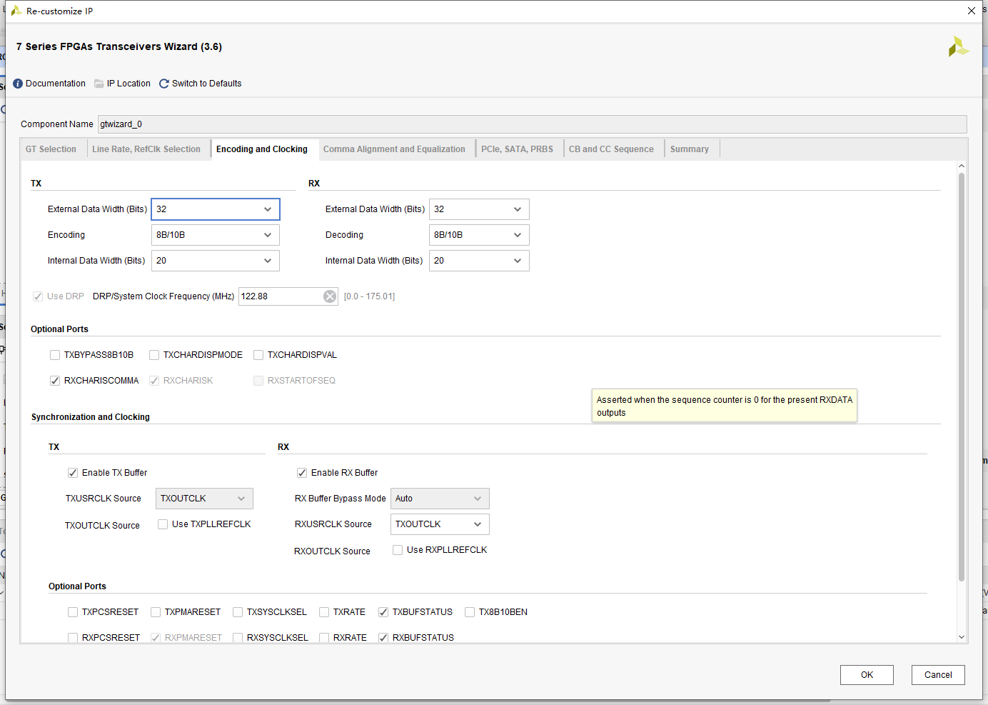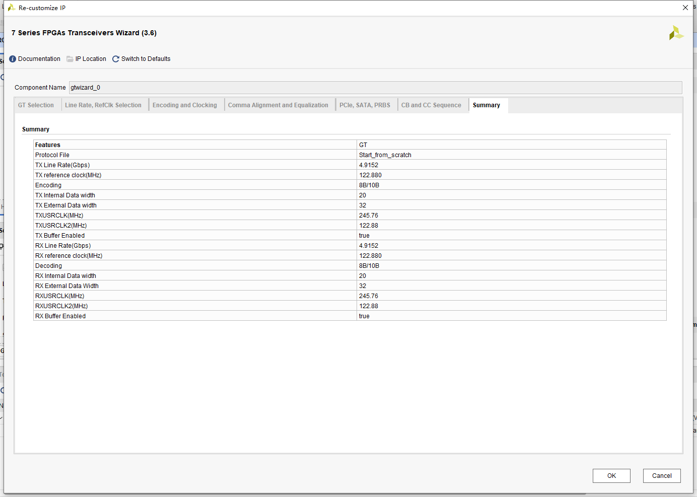 可以看到,虽然K7系列GTX最高可以跑到12.5Gbps,但这跟速度等级和封装都有关系,是在-3的速度等级,FF封装下才有的最高速度12.5Gbps。而现在手头的芯片型号是K7480TFFG901-1,所以最高支持8.0Gbps。其实这在配置IP核的时候就会发现了,线速范围是(0.5-8.0)。所以IP核都是严格和工程的器件相关联的,这点Vivado越做越好了。