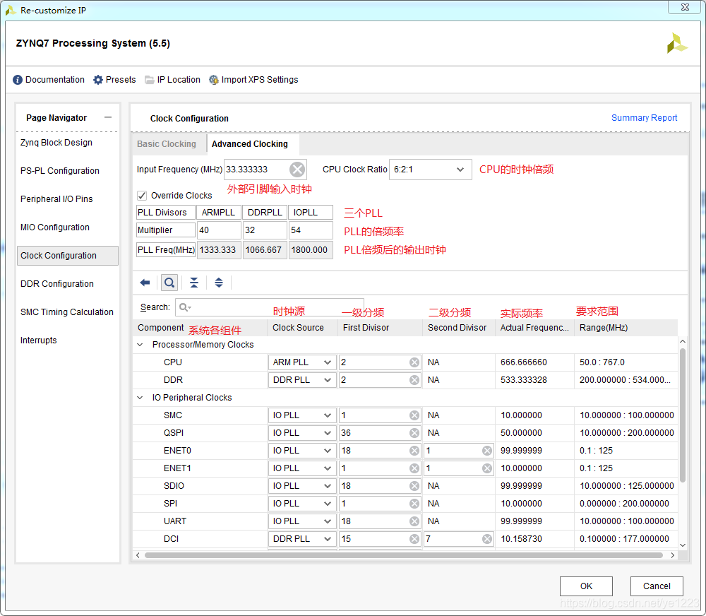 DDR PLL:DDR DRAM控制器和AXI_HP接口的通用时钟源。