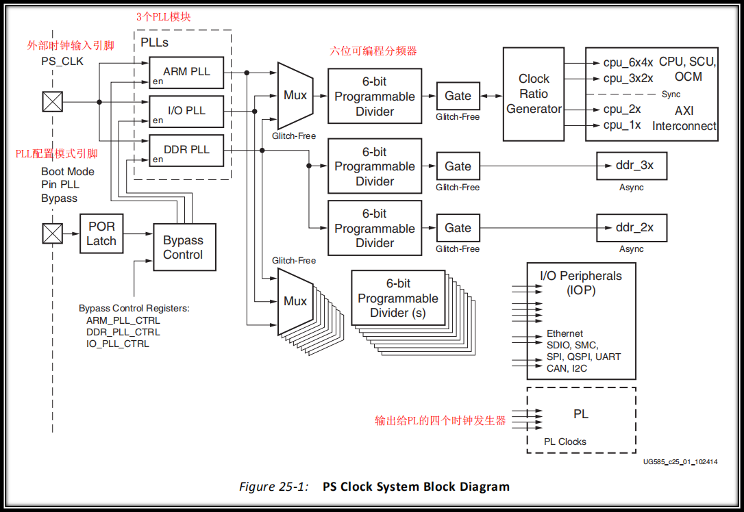 PLL,每个PLL分别和CPU、DDR、外设系统时钟有着松散地联系,时钟子系统的框图如下图示(源于《UG585 - Zynq-7000
