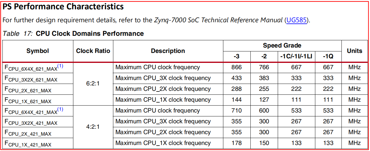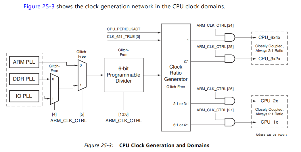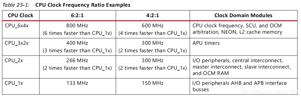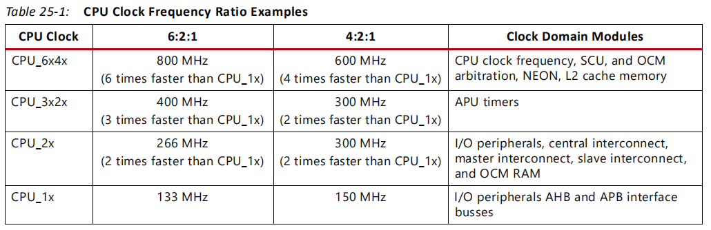 1)。这两种比率模式的选择由:CLK_621_TRUE [0]决定。。表25-1显示了在每个时钟域中工作的这些模式和模块的频率示例.(请参阅zynq-7000 soc数据手册。)