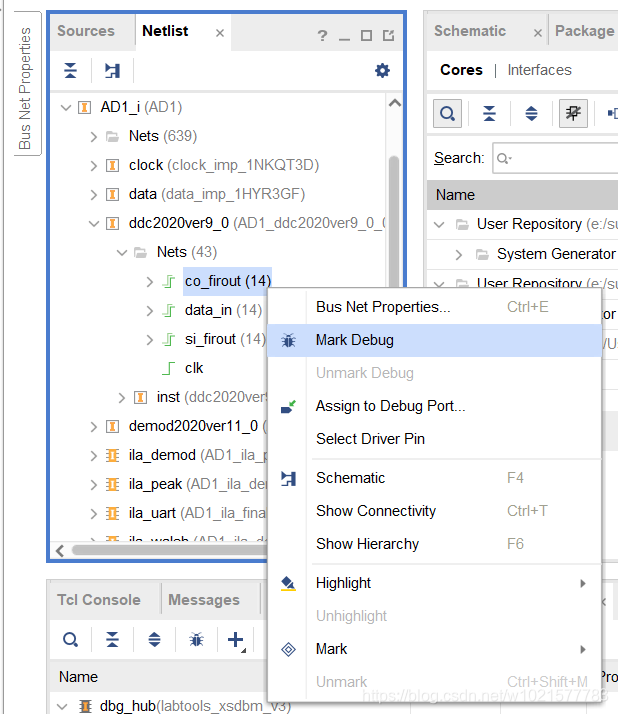 如图,我添加了顶层文件为AD1_wrapper,里面包含了一个名为AD1_i的模块,我想观察其中DDC模块的I路输出,依次点开找到这个引脚,右键mark debug即可,当然也可以直接选下面的assign to debug port(不推荐)。