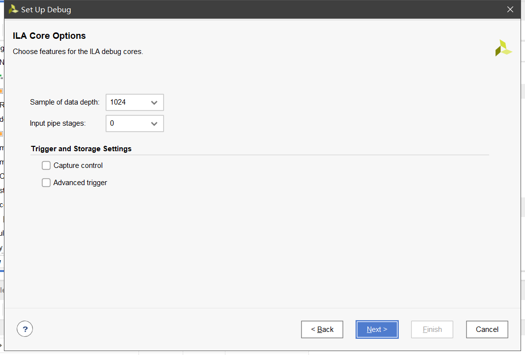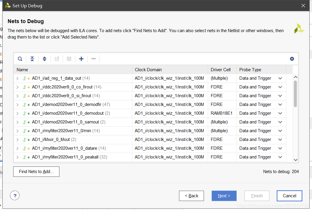 就一直无脑next直至这个窗口,检查一下刚才mark的信号都在不在,有没有缺失clock domain的,这个是ila的工作时钟,一般选用全局工作时钟。