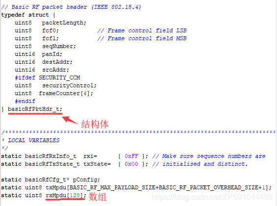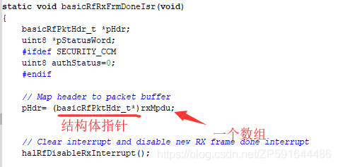 在上面的图片中,basicRfPktHdr_t是一个结构体,rxMpdu是一个长度为128个字节的数组名,pHdr是一个结构体指针。这让我很是清楚这么写是什么意思,因为以前从没有遇到,现在遇到了就算是进一步学习C语言了。