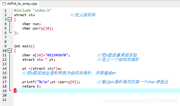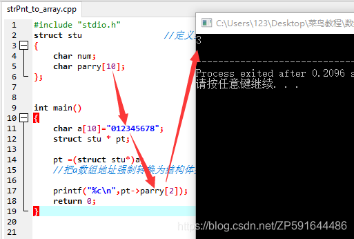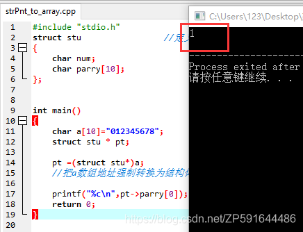 如图,在程序中,首先在main函数前面定义了一个结构体,然后在main里面定义了一个数组,结构体指针,接着将数组指针强制转换结构体指针,最后输出。输出的格式是pt->parray[0],即是结构体自己属性值。编译运行看看会出现什么样的结果。
