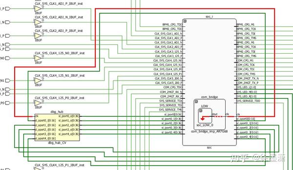 Debug Hub 就是 Jtag 与 Debug Cores 之间的中间件,如果它没时钟或者时钟没有运行,jtag 就无法识别其他的dbg core。用原理图方式打开,可以查到debug 信号与 dbg_hub 连接到 一起,dbg_hub的信号可能没有连接,下图中直接与地相连。
