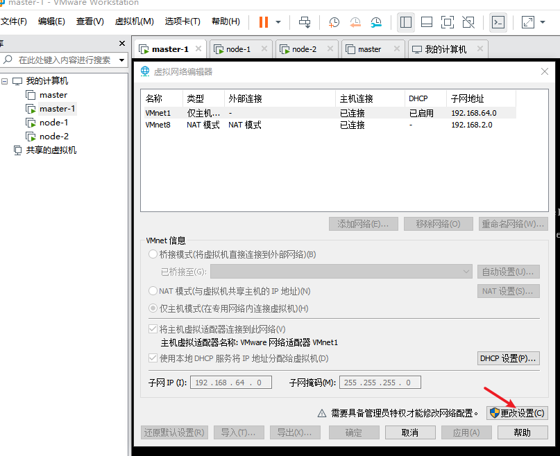 1) 编辑-> 虚拟网络编辑器-> 更改设置,如图