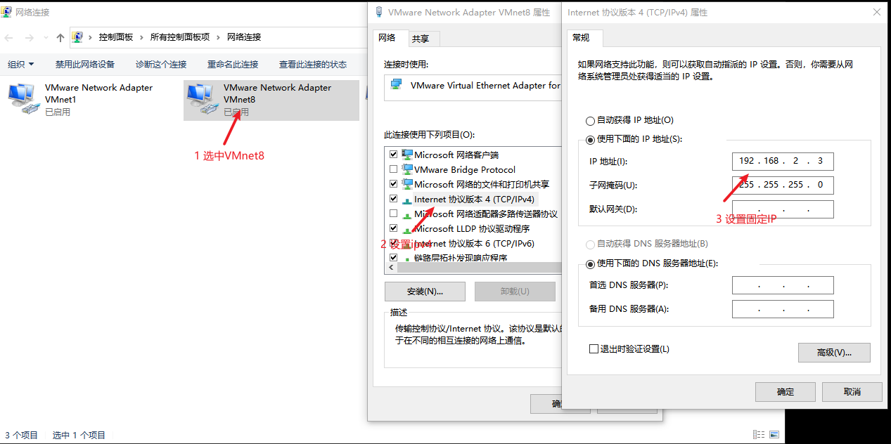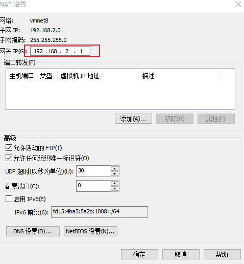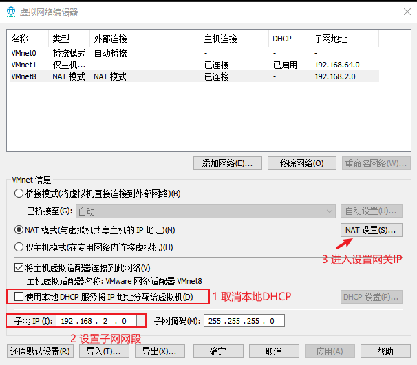 2) 选中VMnet8-> 取消使用本地DHCP服务选项-> 设置子网IP-> NAT设置