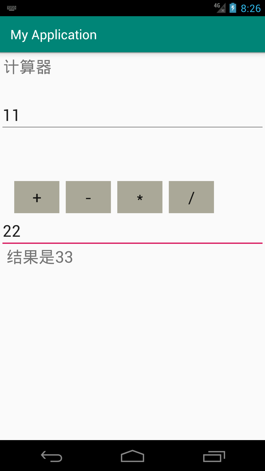 package com.example.myapplication; import androidx.appcompat.app.AppCompatActivity; import android.content.Intent; import android.os.Bundle; import android.view.View; import android.widget.EditText; import android.widget.TextView; public class MainActivity extends AppCompatActivity { @Override protected void onCreate(Bundle savedInstanceState) { super.onCreate( savedInstanceState ); setContentView( R.layout.activity_main ); findViewById( R.id.b_1 ).setOnClickListener( new View.OnClickListener() { @Override public void onClick(View view) { String num1=((EditText)(findViewById( R.id.et_1 ))).getText().toString(); String num2=((EditText)(findViewById( R.id.et_2 ))).getText().toString(); int n1= Integer.parseInt( num1 ); int n2=Integer.parseInt( num2 ); int sum=n1+n2; TextView tv1=findViewById( R.id.tv2 ); tv1.setText( "结果是"+sum ); } } ); findViewById( R.id.b_2 ).setOnClickListener( new View.OnClickListener() { @Override public void onClick(View view) { String num1=((EditText)(findViewById( R.id.et_1 ))).getText().toString(); String num2=((EditText)(findViewById( R.id.et_2 ))).getText().toString(); int n1=Integer.parseInt( num1 ); int n2=Integer.parseInt( num2 ); int sum=n1-n2; TextView tv1=findViewById( R.id.tv2 ); tv1.setText("结果是"+sum); } } ); findViewById( R.id.b_3 ).setOnClickListener( new View.OnClickListener() { @Override public void onClick(View view) { String num1=((EditText)(findViewById( R.id.et_1 ))).getText().toString(); String num2=((EditText)(findViewById( R.id.et_2 ))).getText().toString(); int n1=Integer.parseInt( num1 ); int n2=Integer.parseInt( num2 );