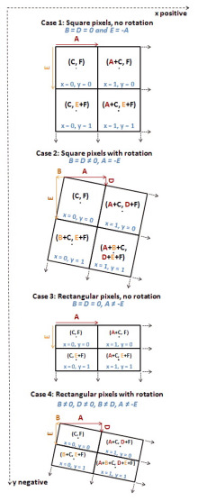 关于旋转系数解释一下,A和D是一个组合,若像素(x, y)的世界坐标为(GeoX, GeoY), 那么像素(x+1, y)的世界坐标为(GeoX+D, GeoY+B),也就是说D和B并不是一个角度,而是说像素坐标在x或y轴移动一个像素时,对应的在世界坐标上x和y的变化值,当画面旋转时,像素沿x轴移动一个像素,则世界坐标的x和y坐标均发生变化。