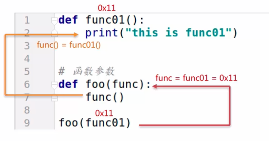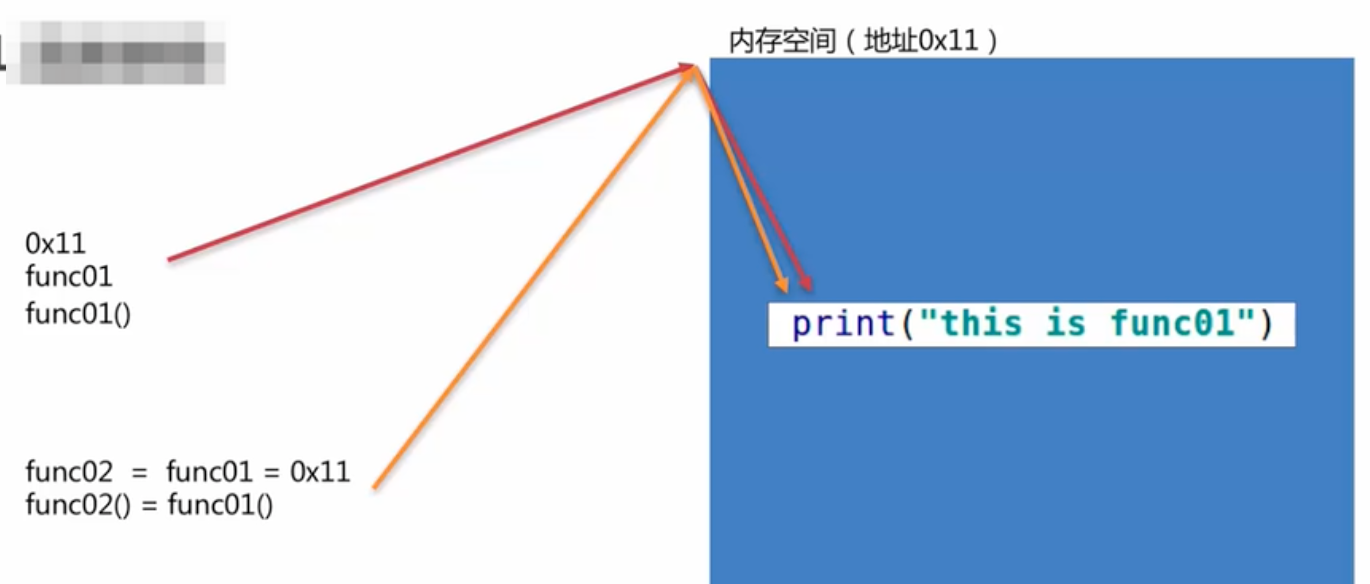 如下图,假设func01 这个函数名存放的地址是0x11, 0x11地址存放的内容是print的内容,执行func01()时,就是执行地址中的代码;又 函数名可以赋值, func2存放的地址就是func01的地址, 所以执行func2() 与func01()的结果是一样的。