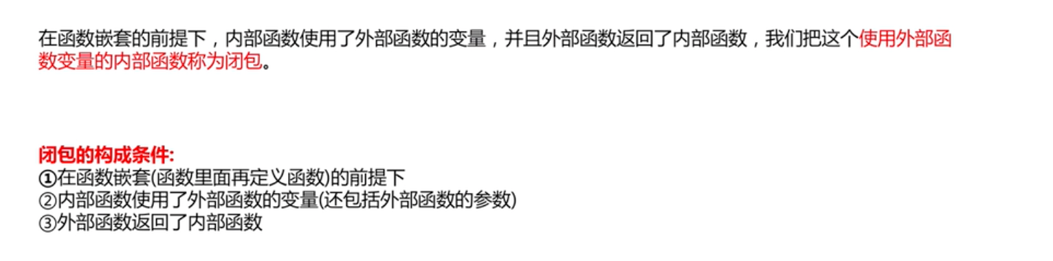 当函数调用完, 函数内部定义的局部变量就会被销毁掉,但是我们有时候需要保存函数内的变量值, 比如在这个变量的基础上,进行其他的运算。怎么办呢? 就是使用闭包来解决这个问题。