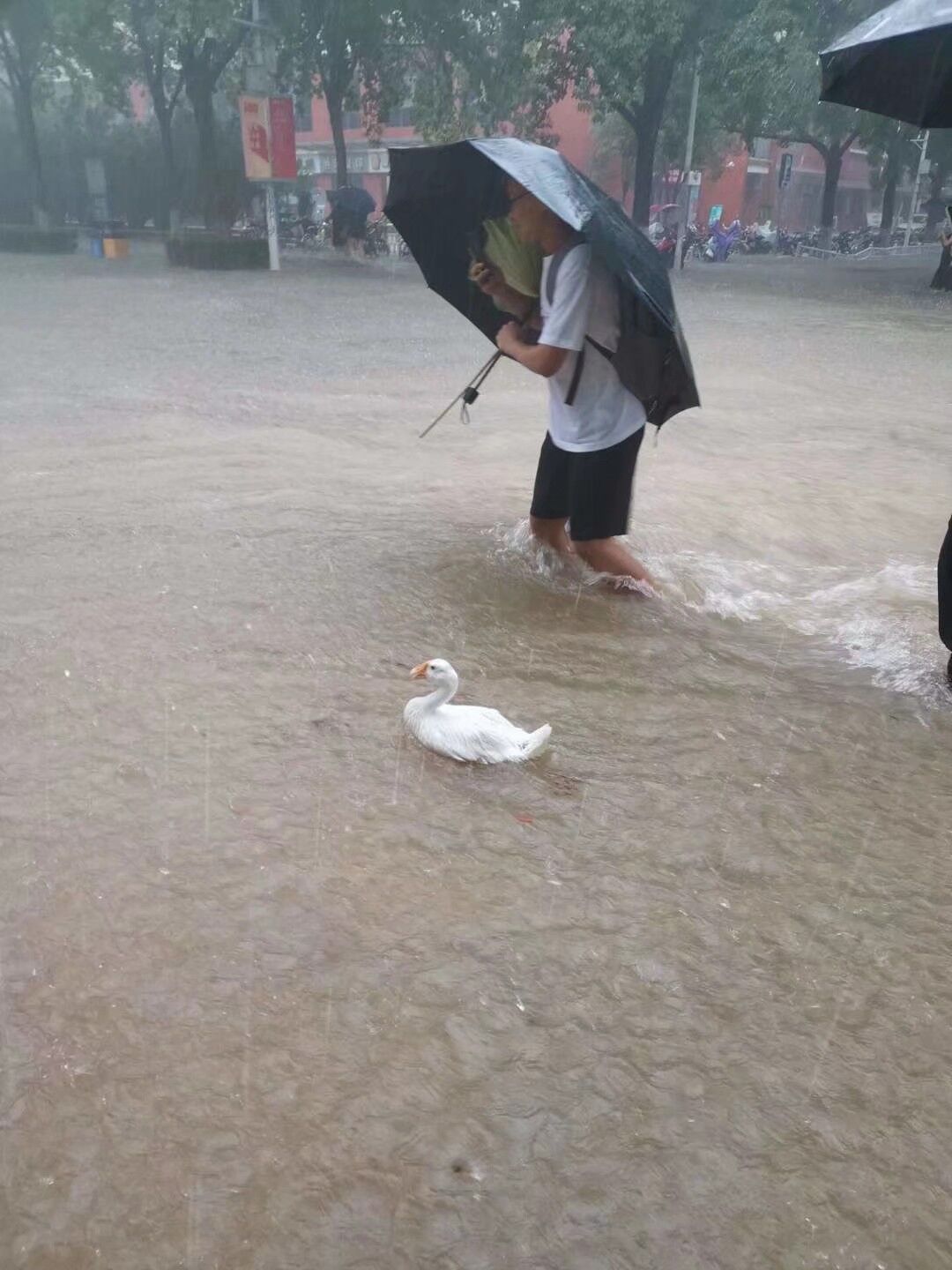 到了16时-17时,郑州地区的雨量出现峰值,高达201.9毫米,打破了中国本土气象站小时雨强的纪录。朋友圈里不断地出现校园里的各处奇观,松园广场被灌满,眉湖里的天鹅顺上升的水位飘出,鱼儿们跳的满岸都是,甚至自习室出现了虾的踪迹。这是得多大的雨啊,校园这般景象。