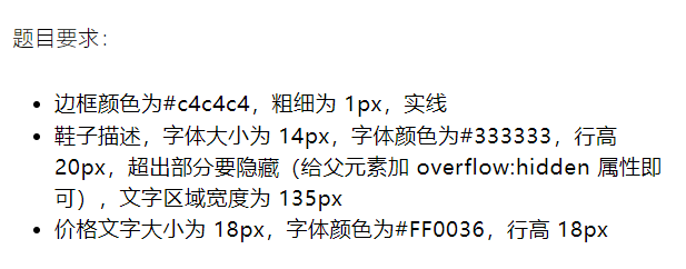 /* 这个题目中有个容易搞错的点,即“居中”的实现: 1. 图片的居中 图片的居中是通过给div.box设置text-align: center;实现的,这是因为图片是行内元素,这个比较好理解。 2. div.introduce的居中 div.introduce的居中是通过margin: 0 auto;实现的,因为这是个宽度小于父元素的块状元素,所以要使用margin来让它居中,text-align: center;无法使块状元素本身在父元素里居中。 3. 价格的居中 价格的居中也是通过给div.box设置text-align: center;实现的,这个具有一定的迷惑性,其实这是因为div.price继承了div.box的text-align属性,从而使里面的价格文本居中了。 */ .box { width: 234px; border: 1px solid #c4c4c4; /* text-align: center; 这一句可以实现图片的居中和价格的居中 */ /* 因为图片和div.price元素中的文本内容都是行内内容 */ text-align: center; padding: 20px 0px; } img { width: 185px; height: 185px; margin-bottom: 8px; } .introduce { width: 135px; /* 需要给div.introduce设置高度,否则不存在文本超出这个盒子这个情况根本不会发生 */ /* 因为盒子的高度在不设置的情况下会随着内容的增加而增加,内容永远不会超出盒子 */ height: 40px; font-size: 14px; color: #333; line-height: 20px; /* 给div.introduce设置width为135px后,可以使用margin: 0 auto;使它在div.box元素中左右居中 */ margin: 0 auto; /* 重新设置margin-bottom可以覆盖上一句margin简写中的margin-bottom的值 */ margin-bottom: 10px; /* 让超出的文本隐藏 */ overflow: hidden; } .price { font-size: 18px; color: #ff0036; line-height: 18px; }