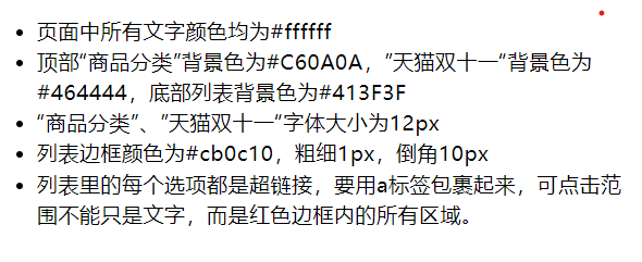 1 <!DOCTYPE html> 2 <html lang="en"> 3 <head> 4 <meta charset="UTF-8"> 5 <title>案例</title> 6 <link rel="stylesheet" href="./index.css"> 7 </head> 8 9 <body> 10 <ul class="head"> 11 <li class="head-first">商品分类</li> 12 <li class="head-second">天猫双十一</li> 13 </ul> 14 15 <ul class="list"> 16 <li><a href="#">大牌女装</a></li> 17 <li><a href="#">运动户外</a></li> 18 <li><a href="#">潮流男装</a></li> 19 <li><a href="#">美妆洗护</a></li> 20 <li><a href="#">母婴好货</a></li> 21 <li><a href="#">数码家电</a></li> 22 <li><a href="#">家具建材</a></li> 23 <li><a href="#">全球尖货</a></li> 24 <li><a href="#">苏宁易购</a></li> 25 <li><a href="#">汽车用品</a></li> 26 </ul> 27 </body> 28 29 30 </html>