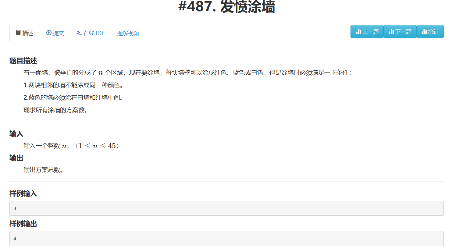 考虑第 1块和 n-1块颜色不一样的情况,现在第 n 块要和第n−1 和 1 都不一样,但是只有3 种颜色,所以n 只有一种颜色选择,这种情况方案数正好是 ans[n−1]。
