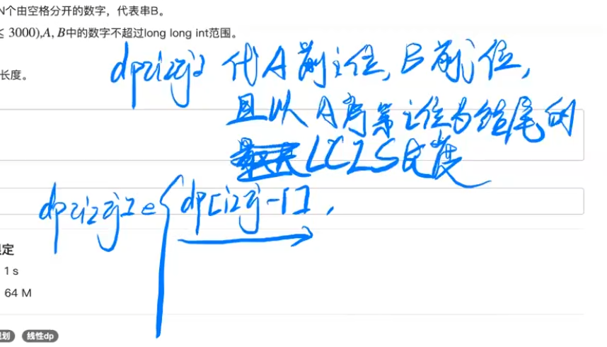 首先定义状态dp[i][j]表示序列ai和序列bj的最长公共上升子序列的长度