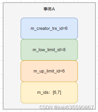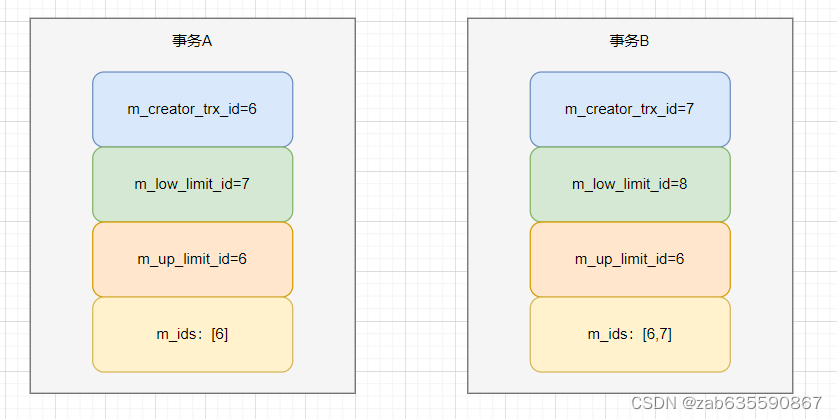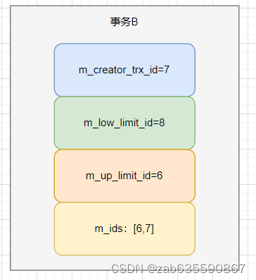 这时,活跃事务就有当前事务(DB_TRX_ID=6)和B事务(DB_TRX_ID=7),所以m_ids=[6,7]