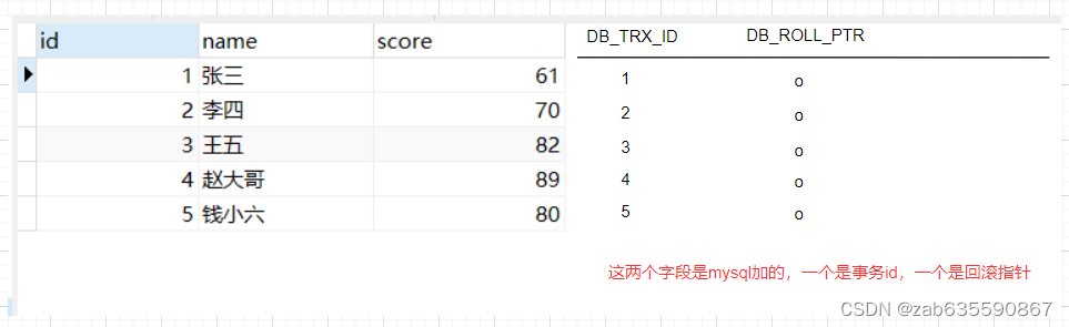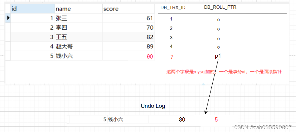 事务B为修改操作,把钱小六的分数调高10分。这时候数据库的数据长这样: