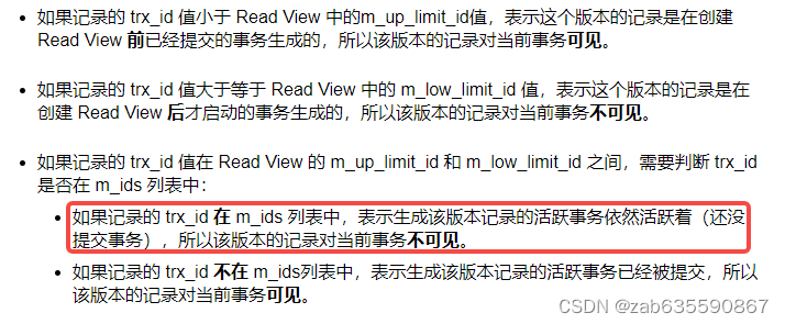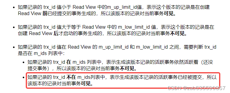 - 如果记录的 trx_id 在 m_ids 列表中,表示生成该版本记录的活跃事务依然活跃着(还没提交事务),所以该版本的记录对当前事务不可见。