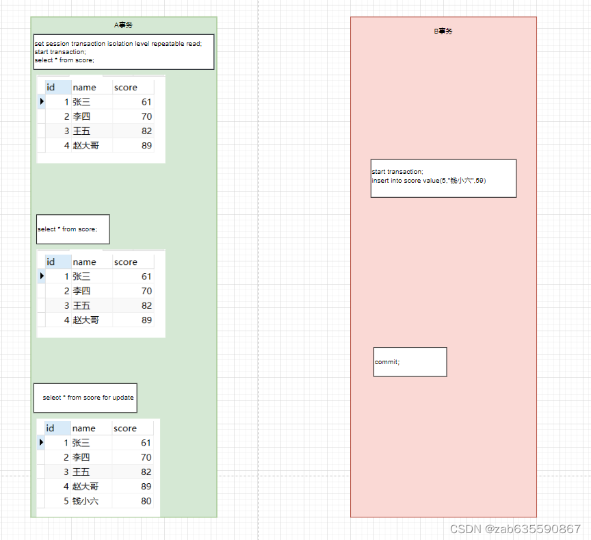 2、执行select * from score for update,数据6出现在A事务的查询结果集中,但是不出现在早期的查询结果集中。这是官方解释的幻读行(也就是多出了id=6这一行)