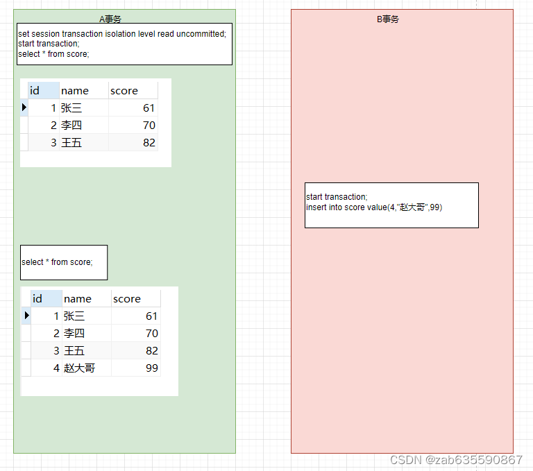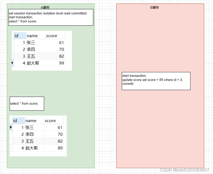 步骤二:B事务修改了钱小六的分数为90分