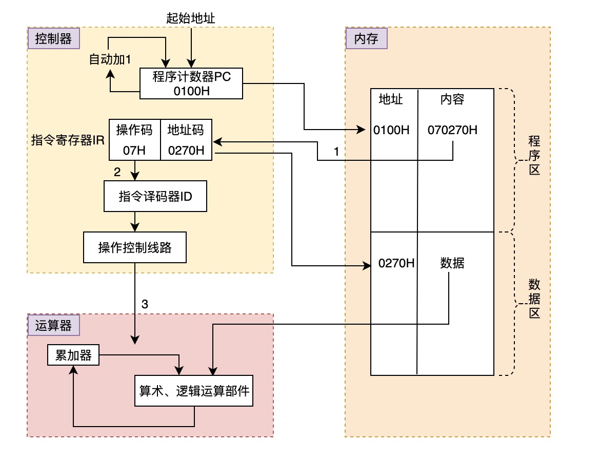 取指令:按照程序计数器中的地址(0100H),从内存中取出指令(070270H),并送往指令寄存器