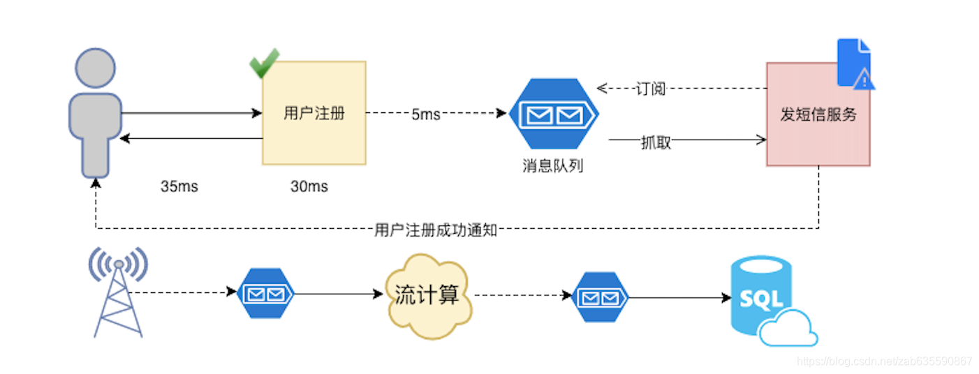 异步:如果耦合度太高,功能就只能是发完短信,才能通知用户注册成功,但是如果发短信调用的是第三方服务,恰好服务又有问题,那么用户注册就得等着服务恢复才能返回给用户说,您注册好嘞。有了消息中间件,可以直接把发短信的命令发给中间件(过程很快),后续详细发送短信的逻辑由另外的监听着消息中间件的命令的服务完成,这个过程就好像???你要送东西给你异地的朋友,没有消息中间件,你得自己亲自把东西带着,做飞机、再转轮船、再转火车、再转汽车、再转摩托车、再步行十里路到他家给他!整个过程都得你亲自完成,你就不能做其他事!但是如果有了消息中间件,你可以到楼下菜鸟驿站发送给某快递厂商,然后把快递编号给你朋友,就说你等着!我有东西给你,你有空了就去取,整个过程你发完快递(过程很快)就可以做其他事了。高效不是吗?