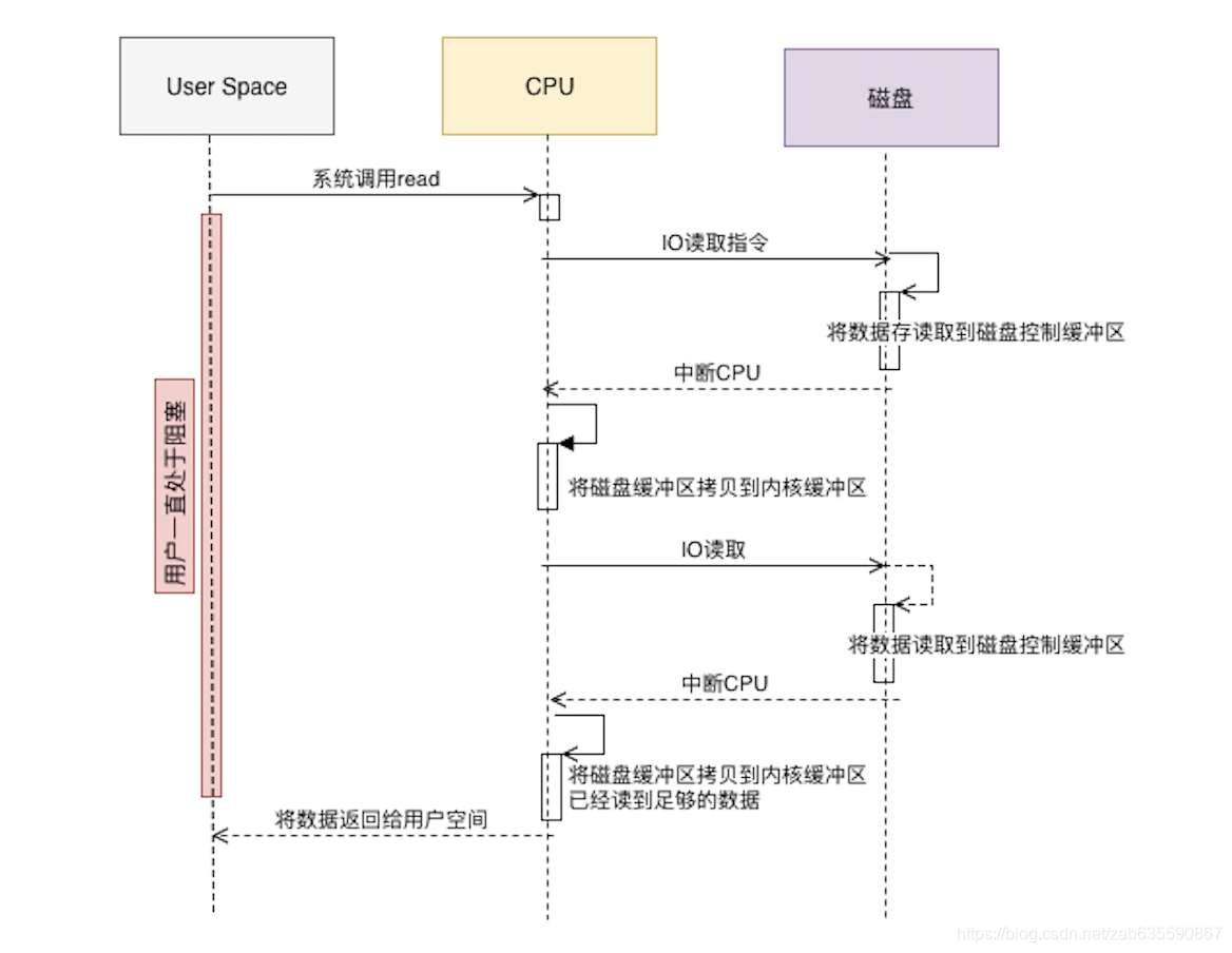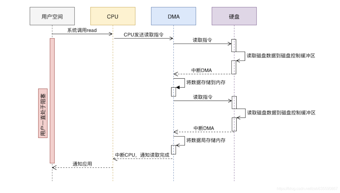 现代计算机对于磁盘-内存的数据IO操作还增加了DMA协处理器来处理,传统流程是