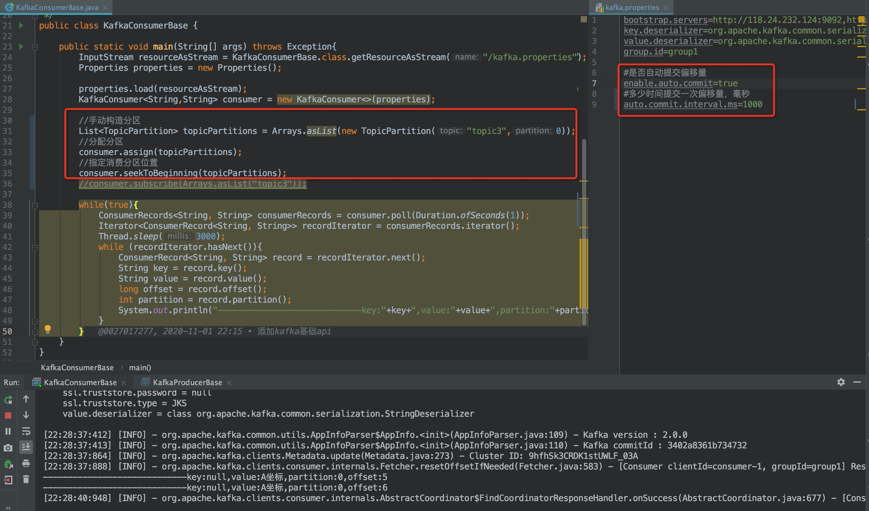 - 注释消费者订阅的topic,添加图片所示的指定分区的代码